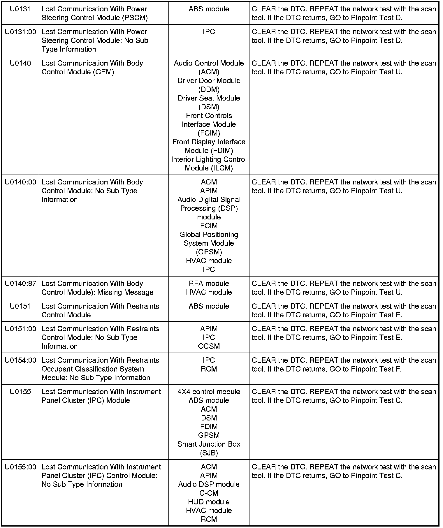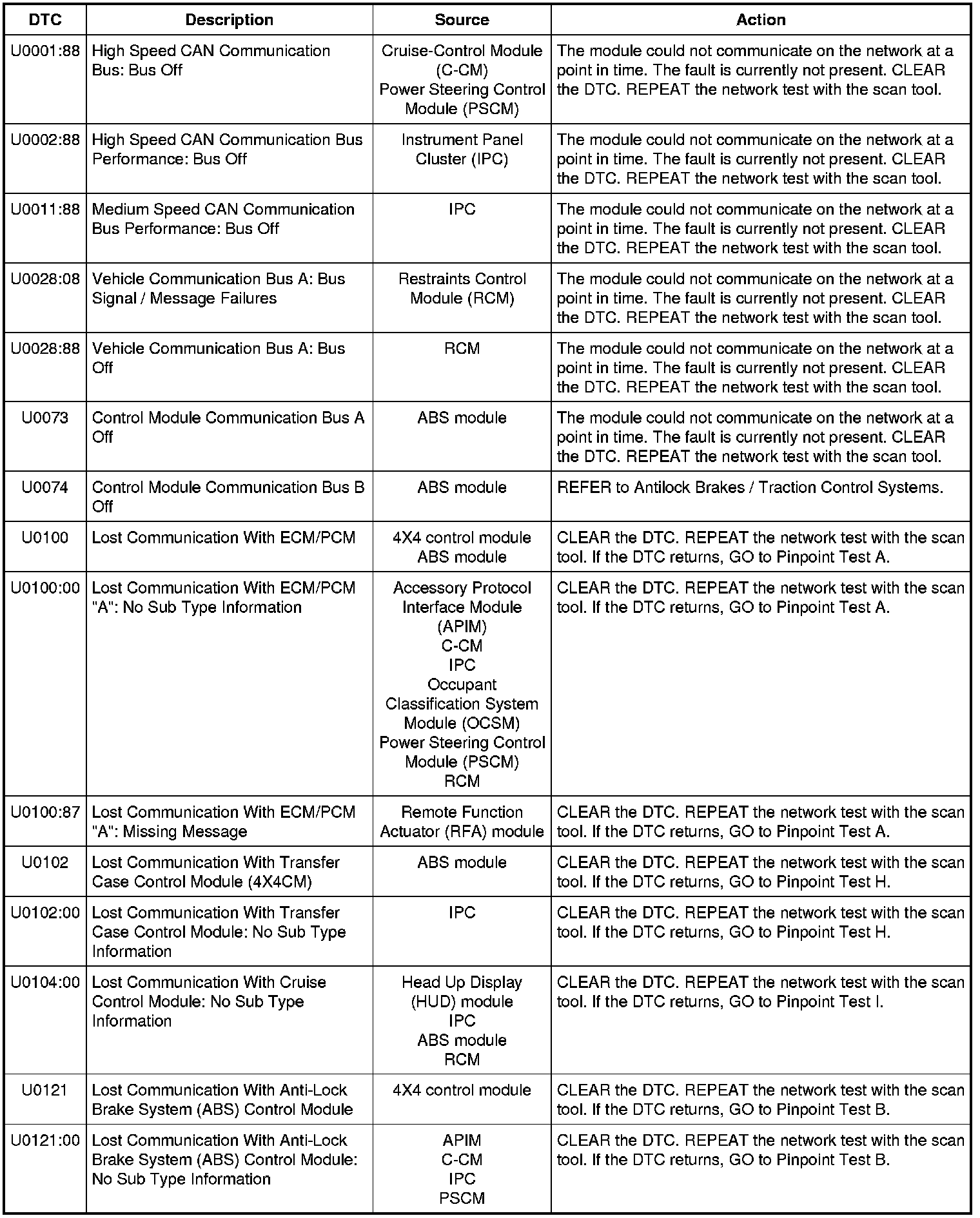 NOTE: Network DTCs (U-codes) are often a result of intermittent concerns such as damaged wiring or low battery voltage occurrences. Additionally, vehicle repair procedures such as module reprogramming often sets network DTCs. Replacing a module to resolve a network DTC is unlikely to resolve the concern. To prevent repeat network DTC concerns, inspect all network wiring, especially connectors. Test the vehicle battery, refer to Battery.