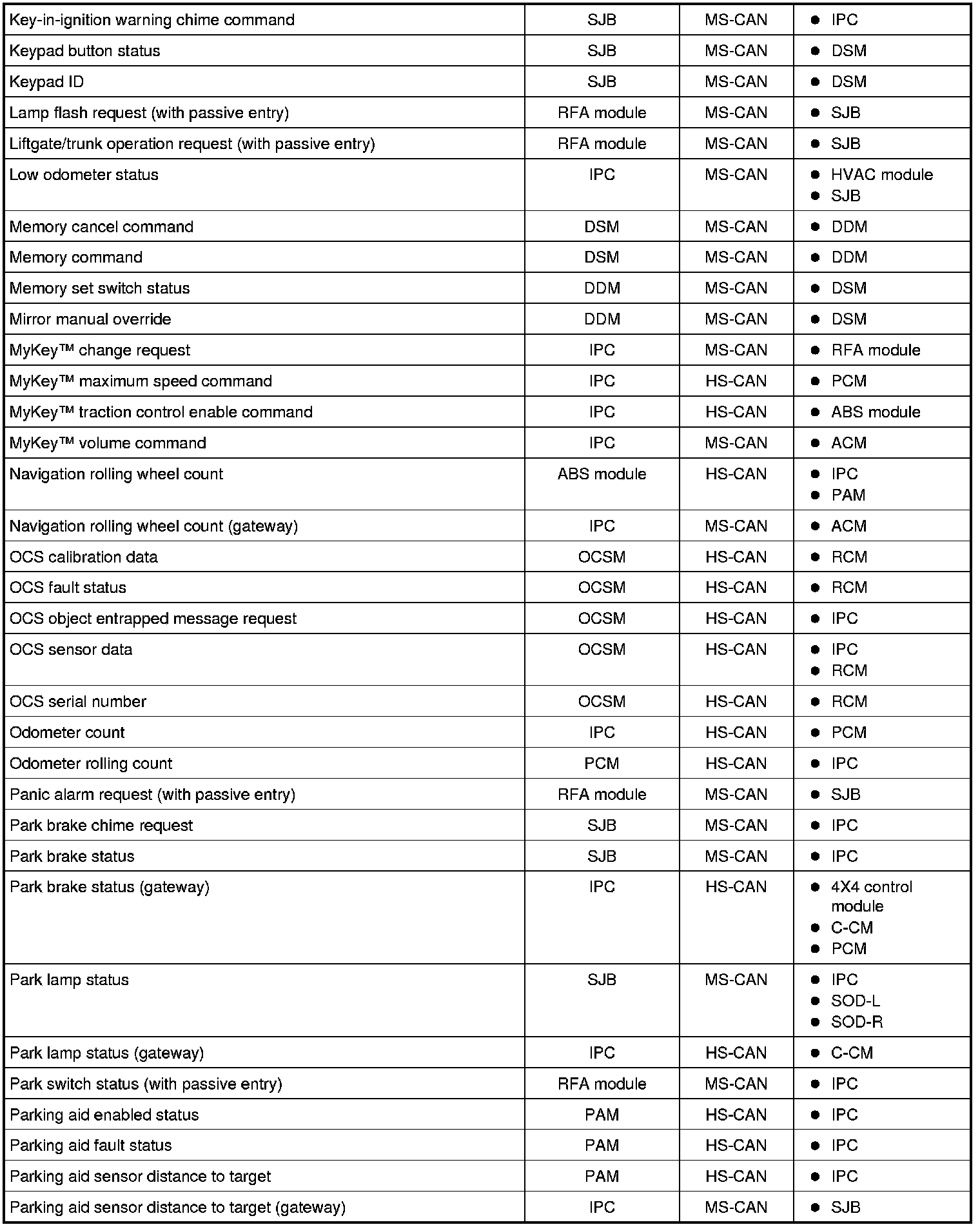 NOTE: This chart describes the specific HS-CAN and MS-CAN messages broadcast by each module, and the module(s) that receive the message.