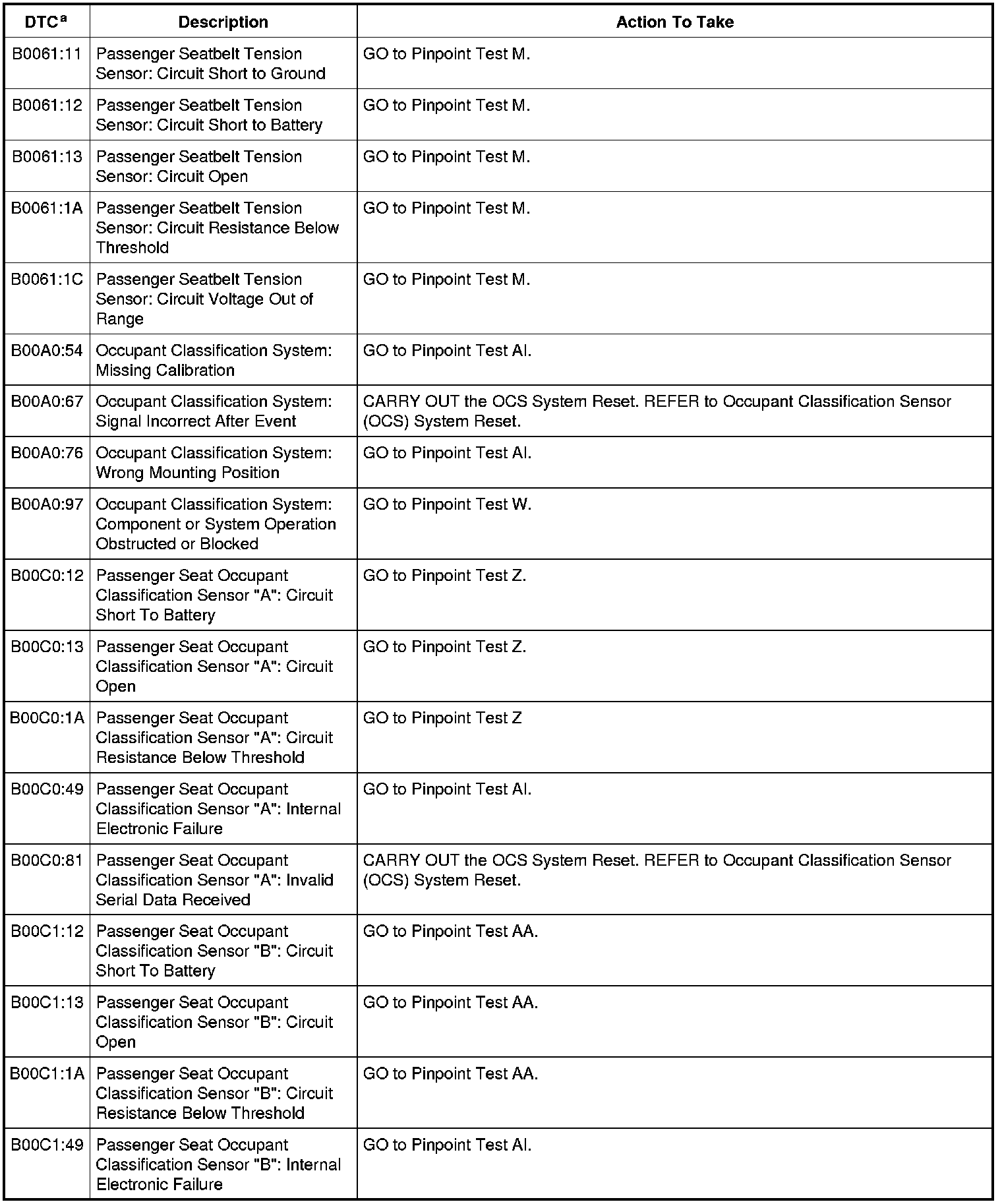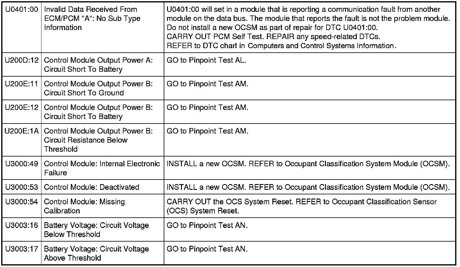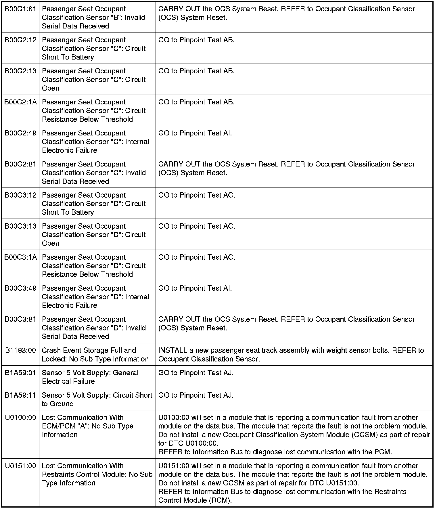 Occupant Classification System Module (OCSM) DTC Chart - Weight Sensor Bolt System
