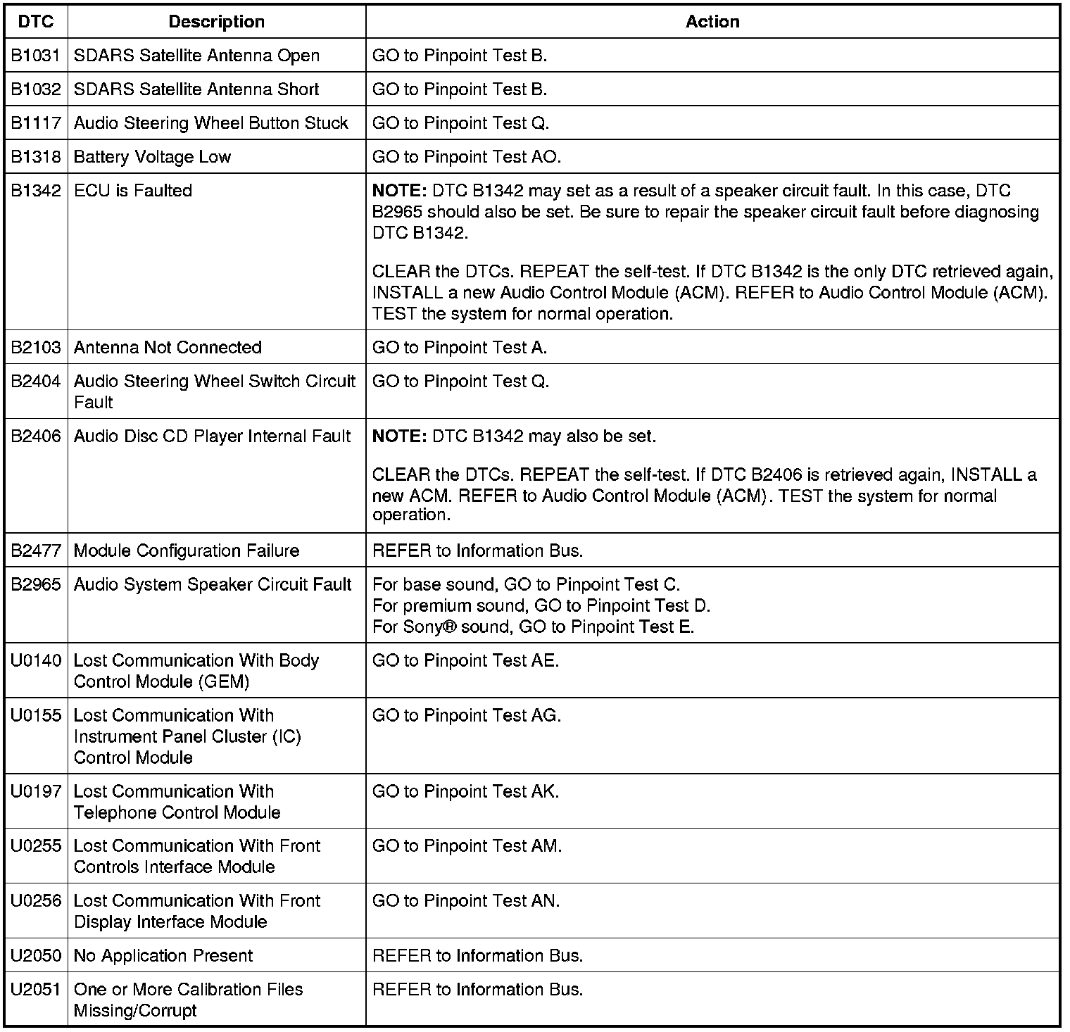 Audio Control Module (ACM) DTC Chart - Without Navigation