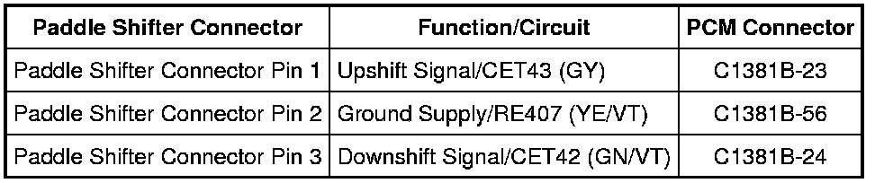 - For vehicles equipped with a 3.5L GTDI engine, measure the resistance between the paddle shifter connector, harness side and the PCM C1381B, harness side using the following chart: