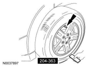 Place the Tire Pressure Monitor Activation Tool on the LF tire sidewall opposite (180 degrees) from the valve stem. Press and release the test button on the special tool. The horn will sound briefly to indicate that the tire pressure sensor has been recognized by the DDM.