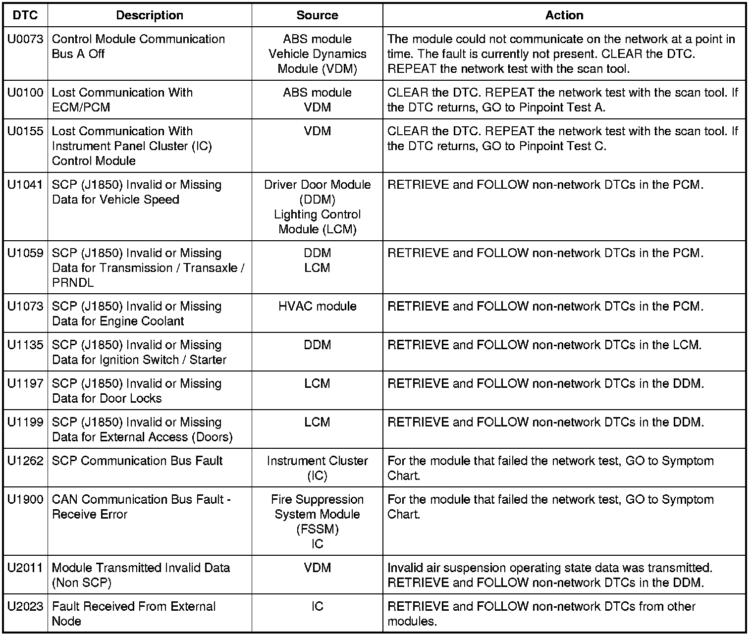NOTE: Network DTCs (U-codes) are often a result of intermittent concerns such as damaged wiring or low battery voltage occurrences. Additionally, vehicle repair procedures such as module reprogramming will often set network DTCs. Replacing a module to resolve a network DTC is unlikely to resolve the concern. To prevent repeat network DTC concerns, inspect all network wiring, especially connectors. Test the vehicle battery, refer to Battery, Mounting and Cables Testing and Inspection.