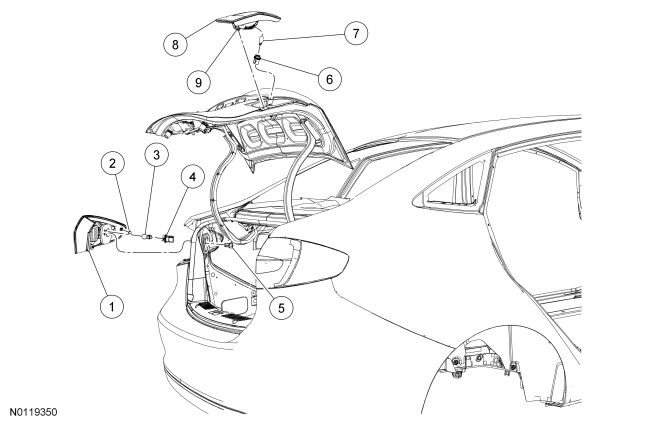 1. Remove the rear outer lamp assembly retaining nut.