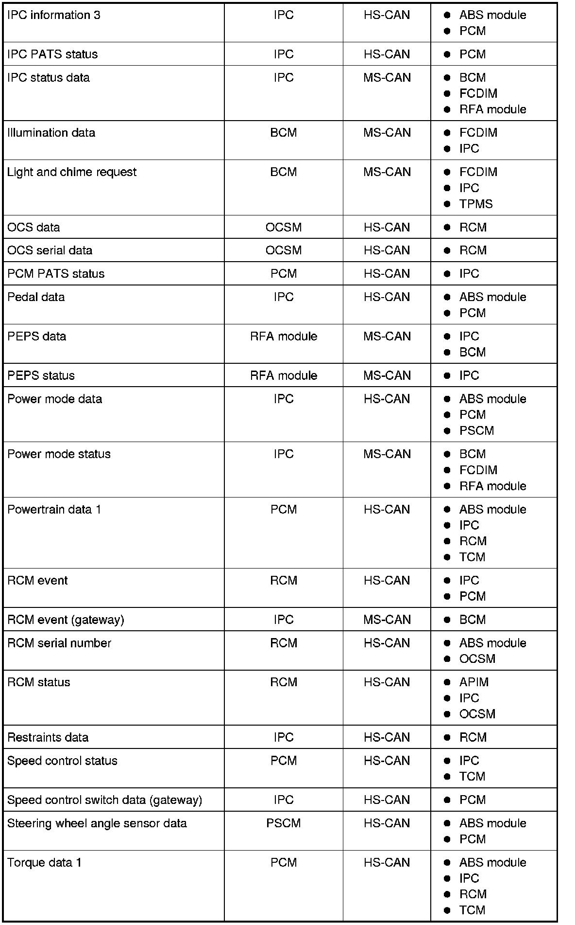 NOTE: This chart describes the specific HS-CAN and MS-CAN messages broadcast by each module, and the module(s) that receive the message.