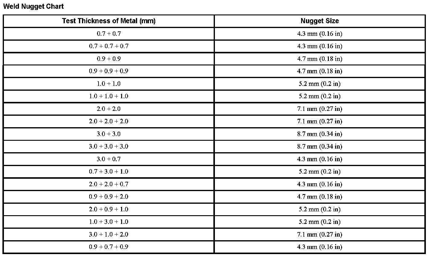 Weld Nugget Chart
