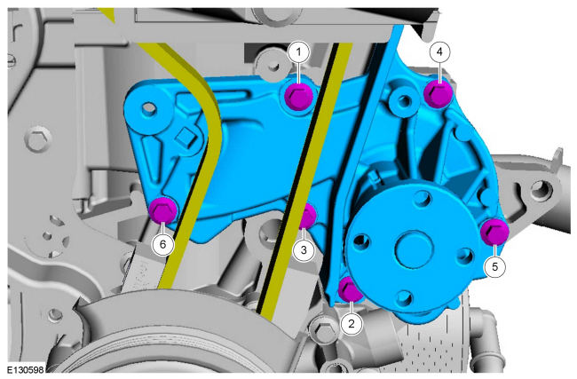 Install a new gasket, the coolant pump and the 6 bolts.