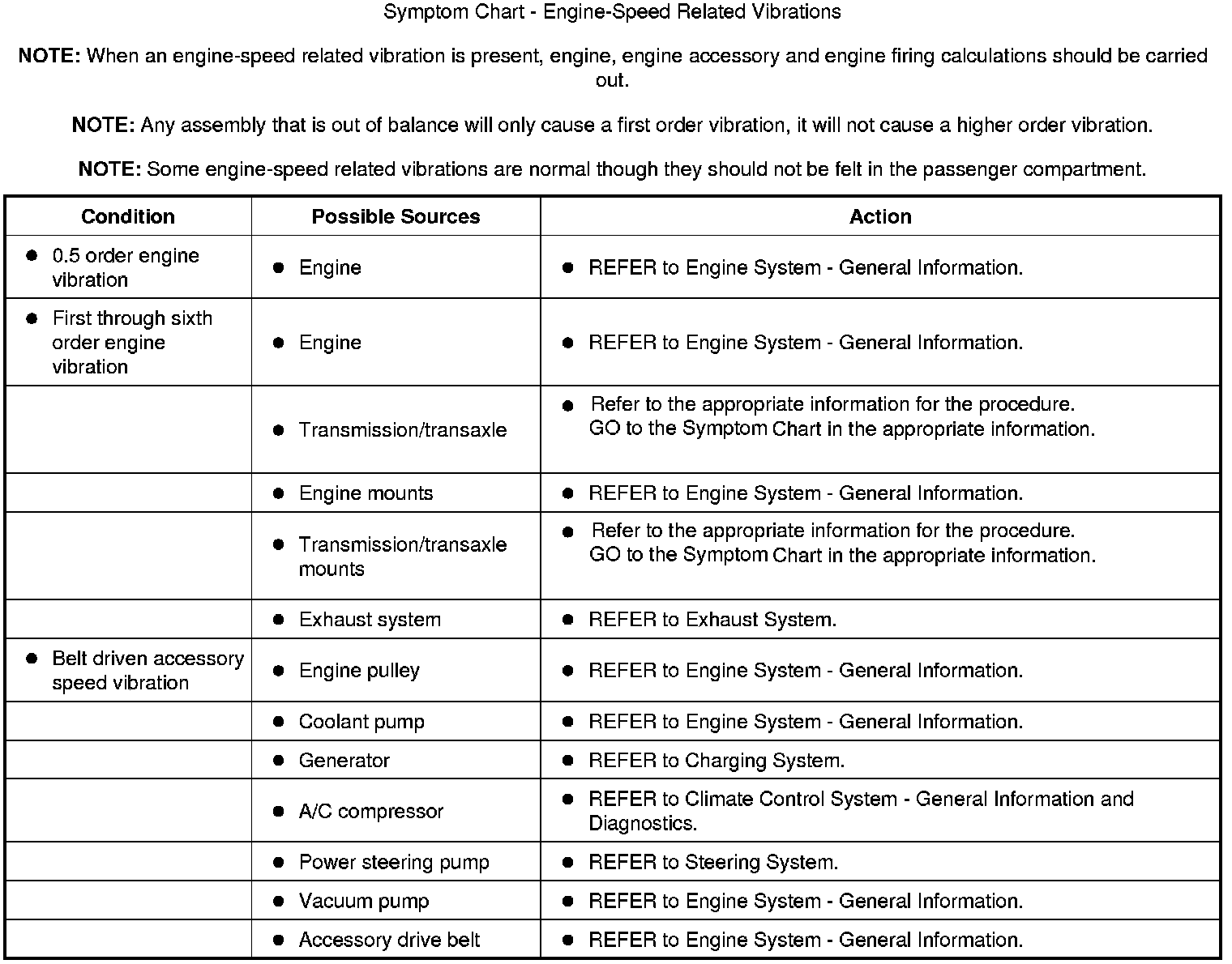 Use the diagnostic instructions along with the necessary listed tools to identify the vibration order and to isolate the symptom and the possible systems associated with that symptom. Then based on the results from the road test, make a determination of which action in the symptom chart to take first. Since it is possible any one of multiple systems may be the cause of the symptom, it may be necessary to use a process of elimination type diagnostic approach to pinpoint the concern. Refer to the indicated information to identify and isolate the cause or rule that system out as being the causal system for the symptom.