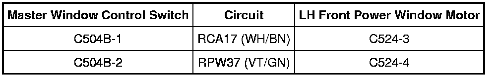 - Measure the resistance between master window control switch C504B-1, circuit RCA17 (WH/BN), harness side and ground; and between master window control switch C504B-2, circuit RPW37 (VT/GN), harness side and ground.