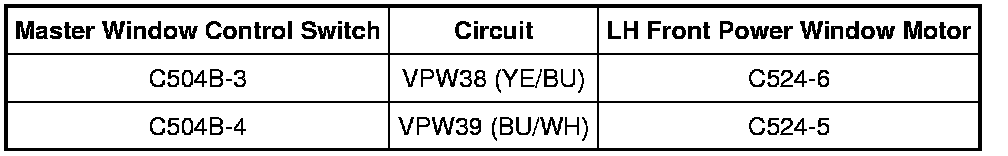 - Measure the resistance between master window control switch C504B-3, circuit VPW38 (YE/BU), harness side and ground; and between master window control switch C504B-4, circuit VPW39 (BU/WH), harness side and ground.