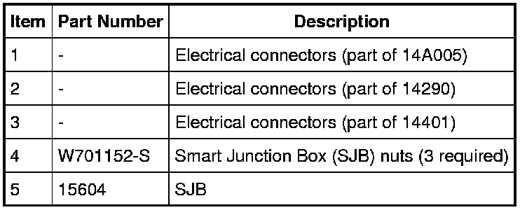 NOTE: Prior to the replacement of the module, it is necessary to upload the module configuration information to a scan tool. This information must be downloaded into the new Smart Junction Box (SJB) after installation. For additional information, refer to Module Configuration Testing and Inspection. In the event that As-Built data is required (SJB does not communicate), all Remote Keyless Entry (RKE) devices must be programmed to the new SJB. A minimum of 2 devices are necessary to complete the configuration and turn off the flashing interior lights.