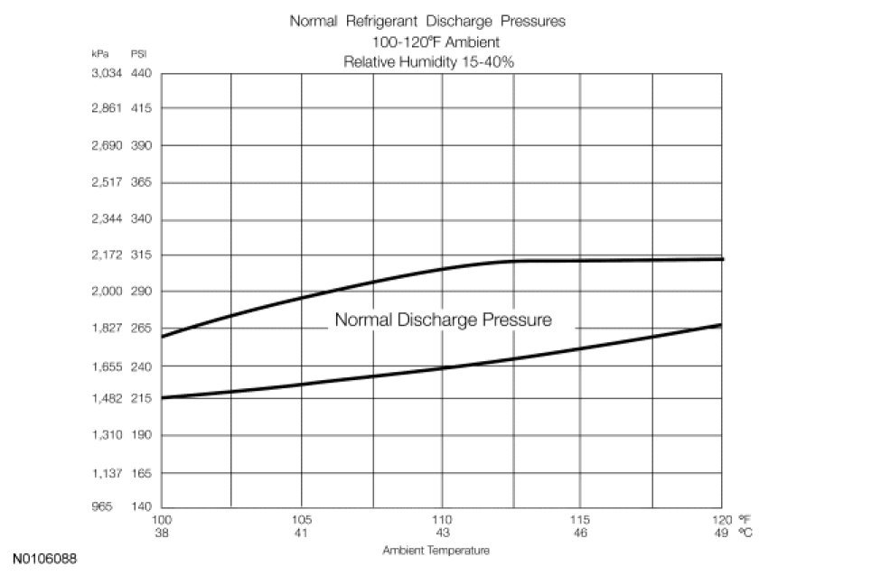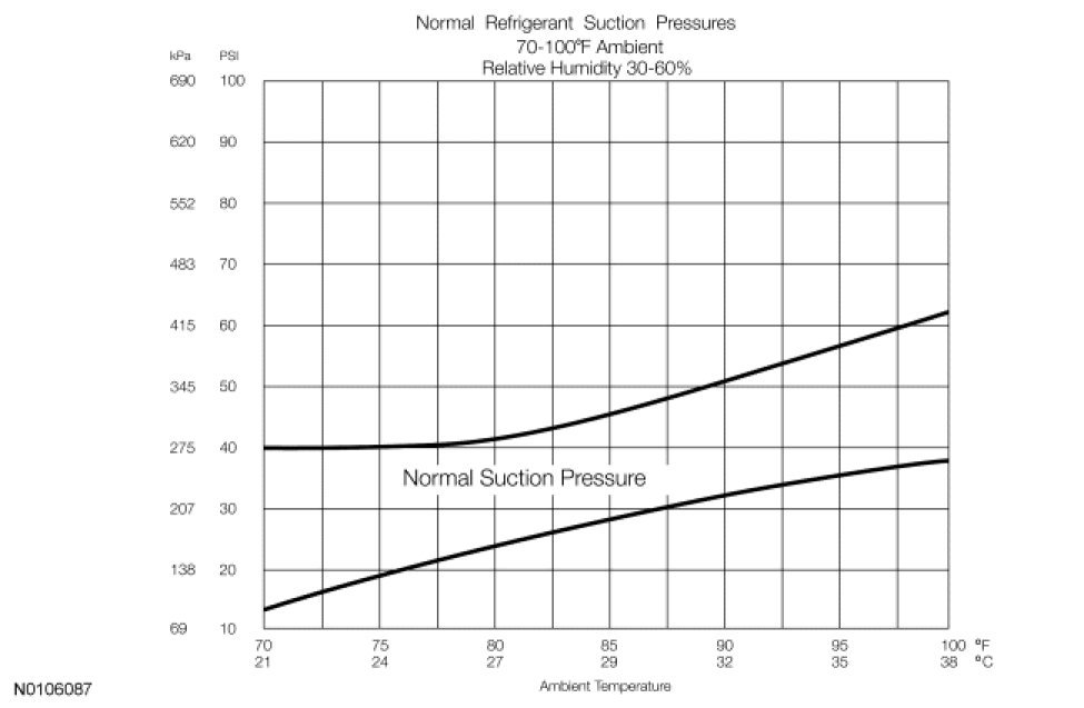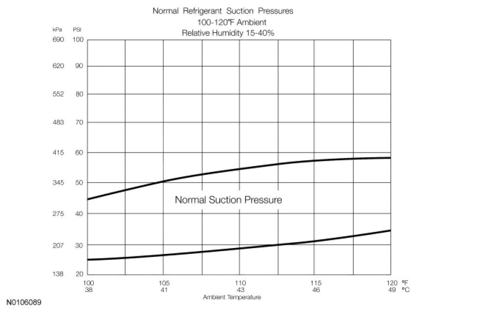 5. Confirm the compressor clutch is engaged and the engine cooling fan(s) are operating or engaged. Allow the vehicle to idle until the suction (low-side) and discharge (high-side) pressures are stable or fluctuate in a range that repeats.