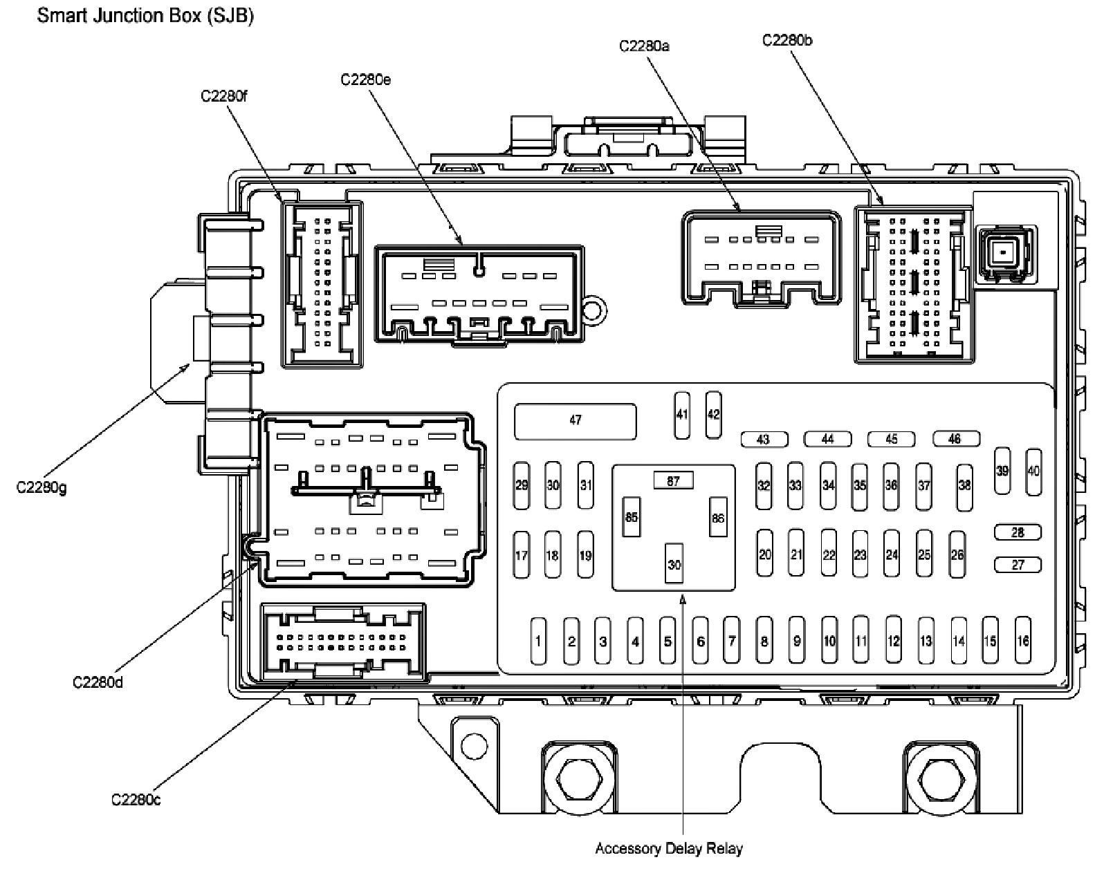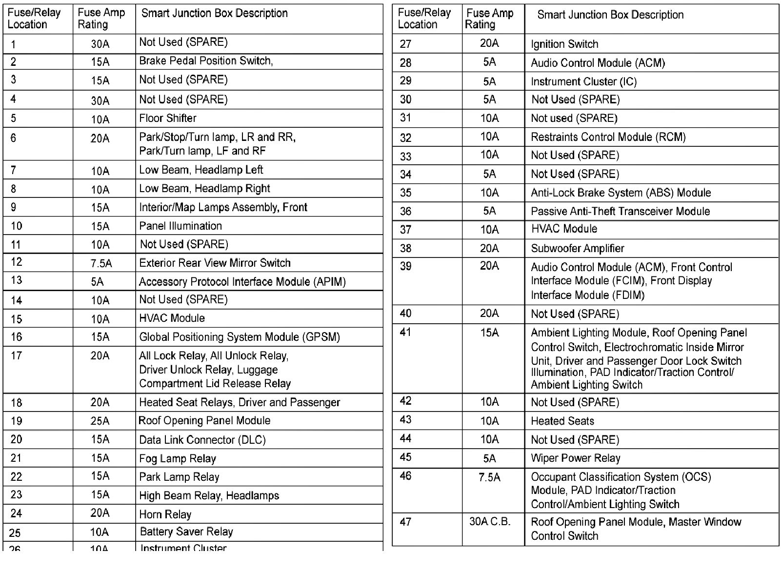 ALLDATA Editor's Note: Ford identifies this one component by 2 different names. Users have reported success comparing these images to determine Application/ID or Location of Fuses and Relays with the Smart Junction Box / Passenger Compartment Fuse Panel.