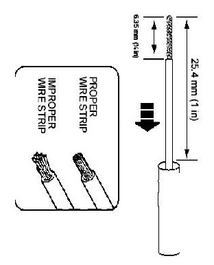 2. Strip 6.35mm (1/4 in) of insulation from each wire end, taking care not to nick or cut wire strands.