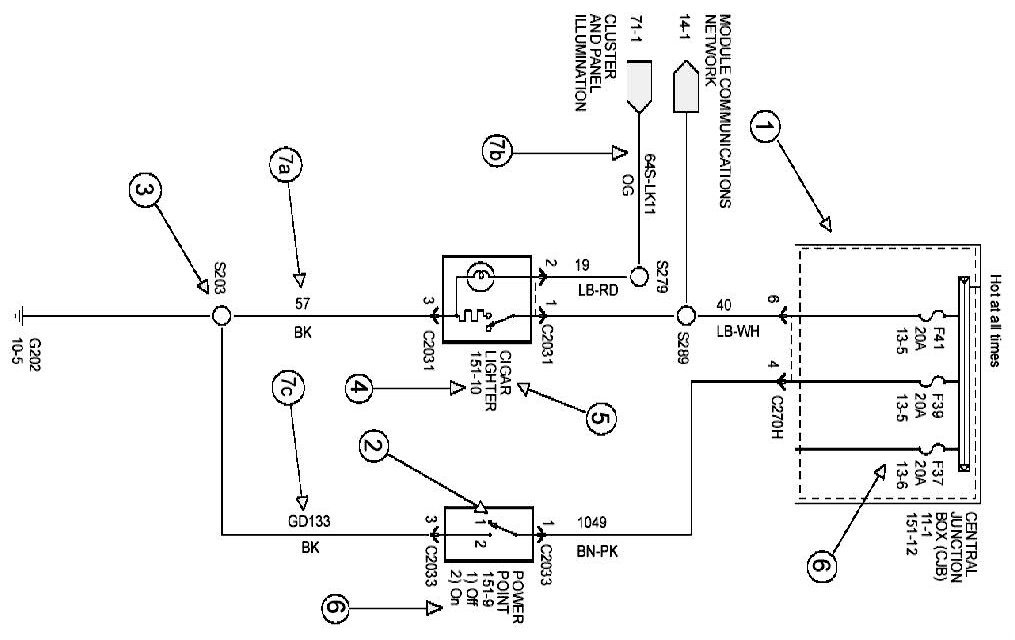Ford Motor Company uses three different circuit numbering conventions: Standard Circuit Numbering System, Global Circuit Numbering System, and New Global Circuit Numbering System (NGCNS). With each, the circuit number (which identifies a specific circuit function) is followed by the wire color.