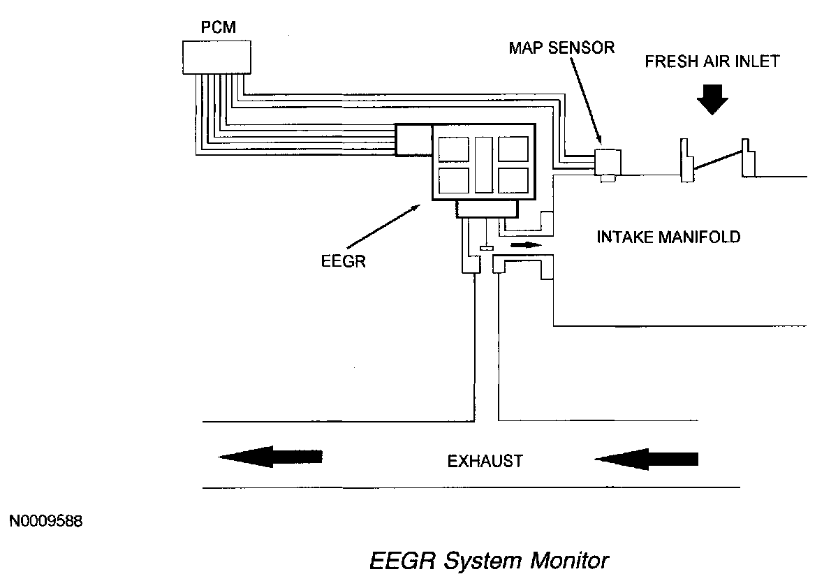 The non-intrusive EEGR system monitor is activated during EGR system operation and after certain base engine conditions are satisfied. Inputs from the engine coolant temperature (ECT) or cylinder head temperature (CHT), intake air temperature (IAT), throttle position (TP), crankshaft position (CKP), MAF, and MAP sensors are required to activate the EEGR system monitor. Once activated, the EEGR system monitor carries out each of the tests described below during the engine modes and conditions indicated. Some of the EEGR system monitor tests are also carried out during a key ON engine OFF (KOEO) or key ON engine running (KOER) self-test.