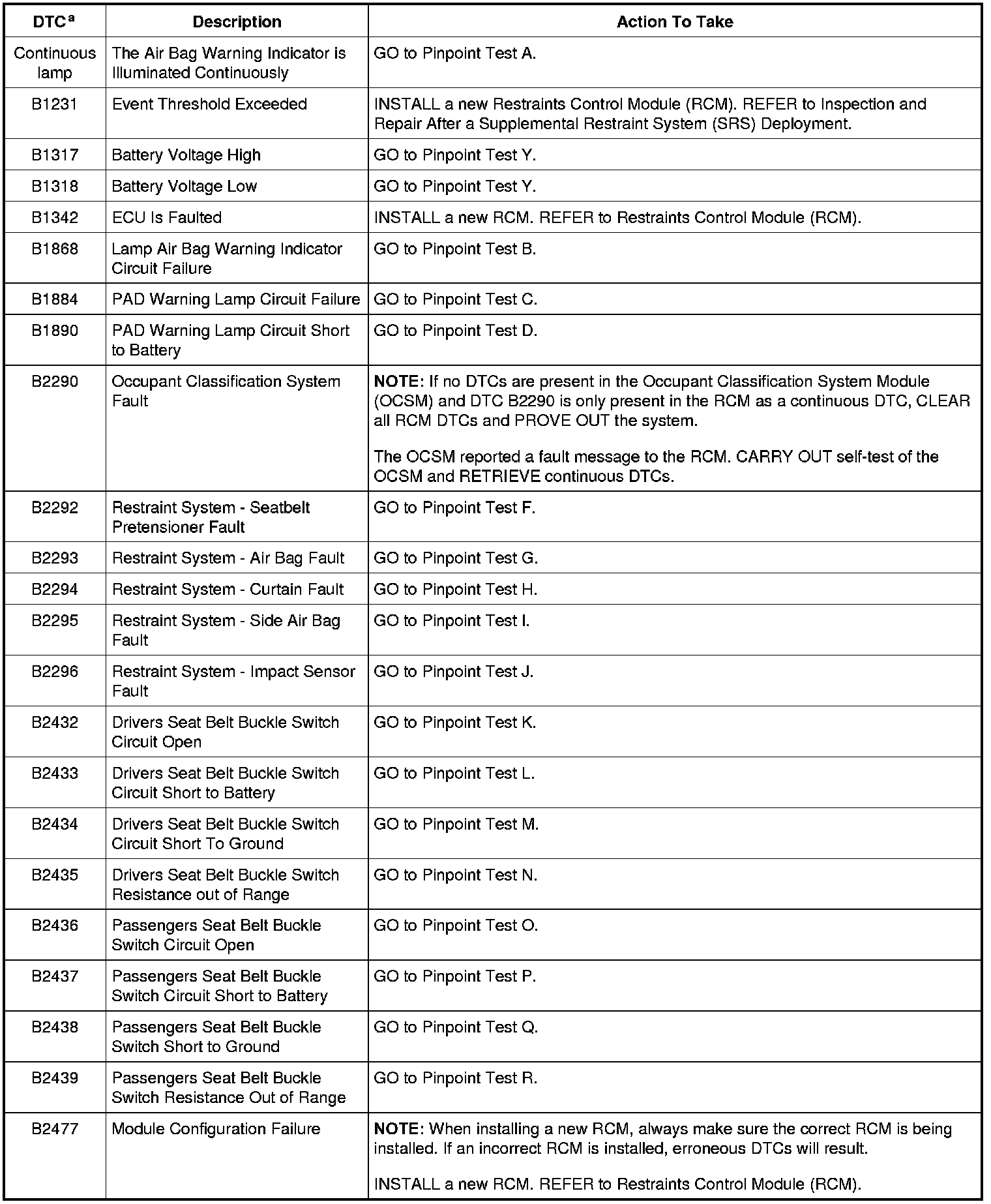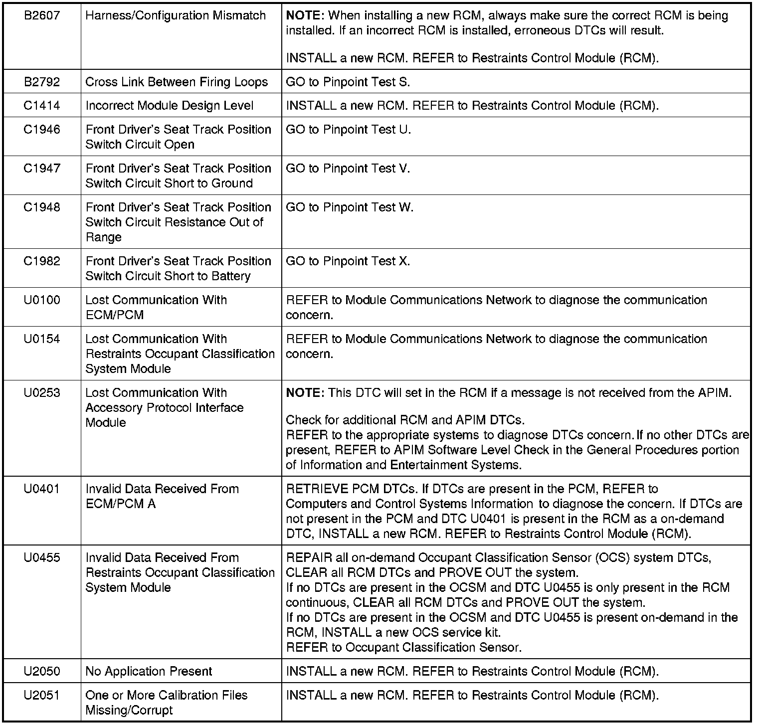 Restraints Control Module (RCM) DTC Chart