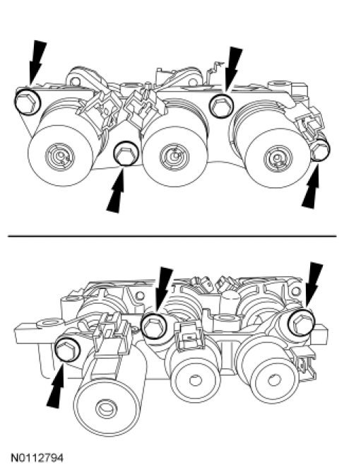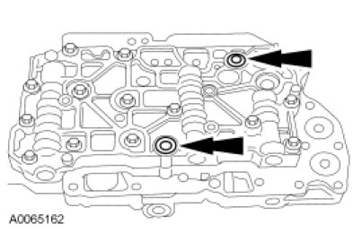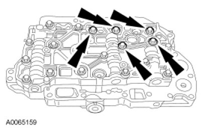 3. Remove the 4 bolts, remove the hold down bracket and remove Shift Solenoid A (SSA), Shift Solenoid B (SSB) and the Line Pressure Control (LPC) solenoid. Remove the 3 bolts and Shift Solenoid C (SSC),Shift Solenoid D (SSD) and Shift Solenoid E (SSE).