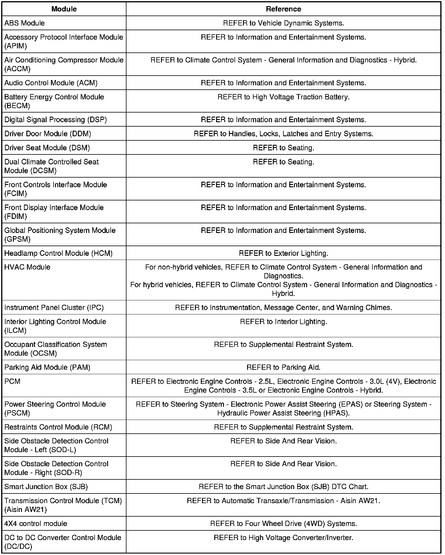 Each module has a comprehensive DTC chart listed in an appropriate system. Refer to the table below for the appropriate system.
