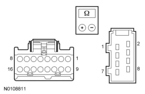 - Measure the resistance between DCSM C3305B-7, circuit VHS26 (VT), harness side and DCSM C3305B-8, circuit RHS05 (YE/VT), harness side.