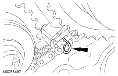 14. Install the primary timing chain with the colored links aligned with the timing marks on the VCT assemblies and the crankshaft sprocket.