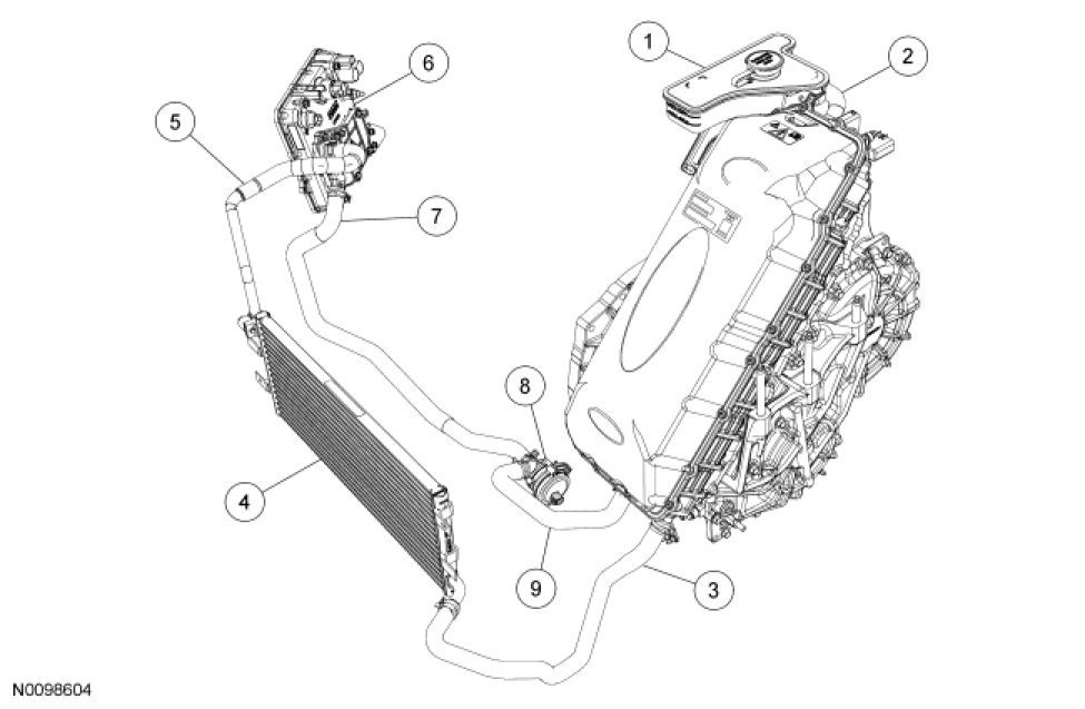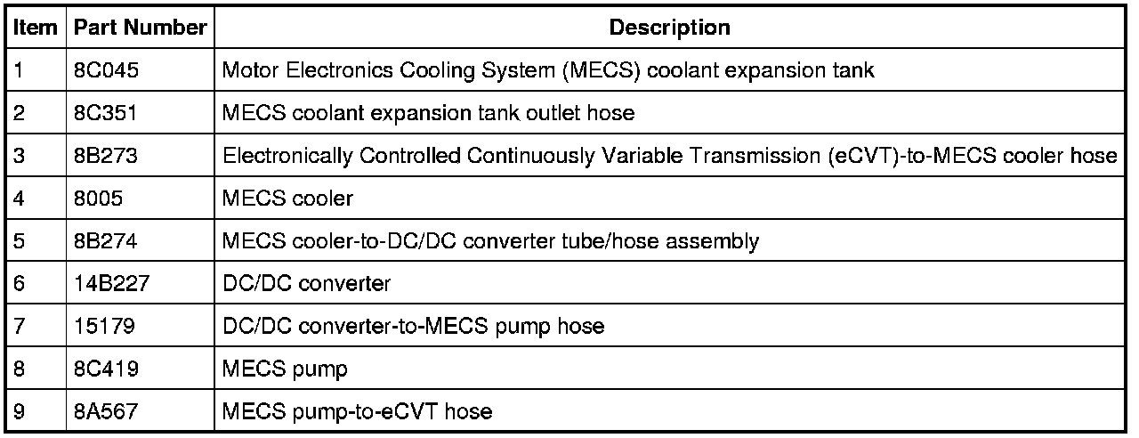 The vehicle uses a pump driven cooling system, referred to as the Motor Electronics Cooling System (MECS) pump, to transfer heat generated by the eCVT and the Hybrid Electric Vehicle (HEV) DC/DC converter to the atmosphere. The system uses a coolant-to-air radiator design.