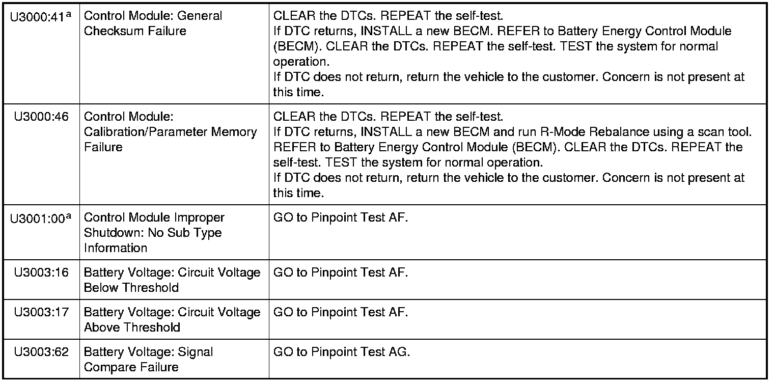 NOTE: Network DTCs (U-codes) are often a result of intermittent concerns such as damaged wiring or low battery voltage occurrences. Additionally, vehicle service procedures such as module reprogramming often set network DTCs. Replacing a module to resolve a network DTC is unlikely to resolve the concern. To prevent repeat network DTC concerns, inspect all network wiring, especially connectors. Test the vehicle battery condition, refer to Battery, Mounting and Cables Testing and Inspection.