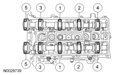 Install the camshafts and bearing caps in their original location and orientation. Tighten the bearing caps in the sequence shown in 3 stages: