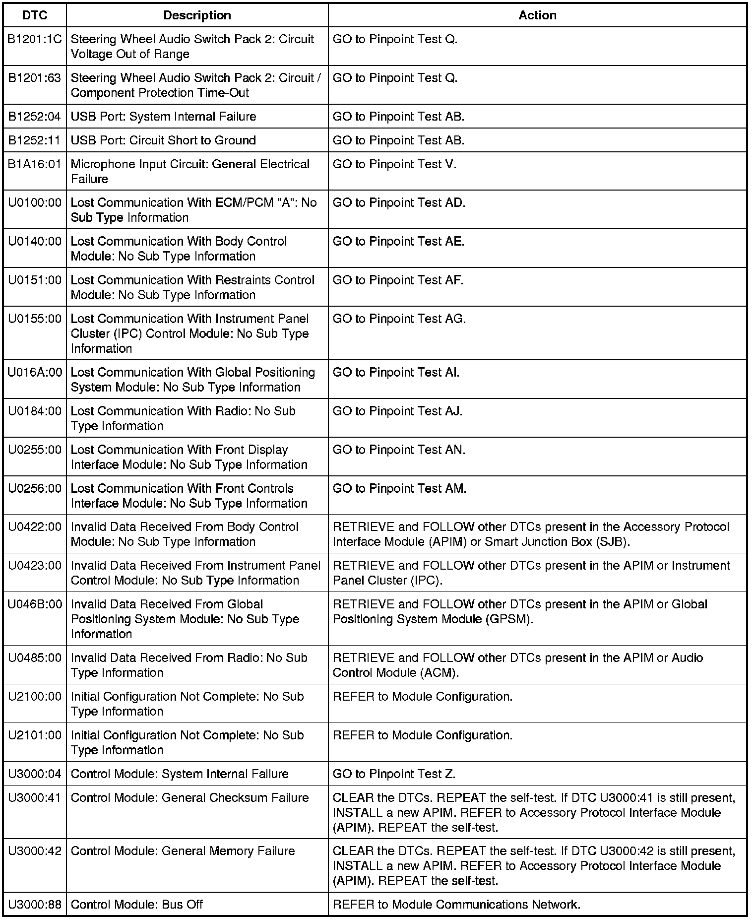 Accessory Protocol Interface Module (APIM) DTC Chart