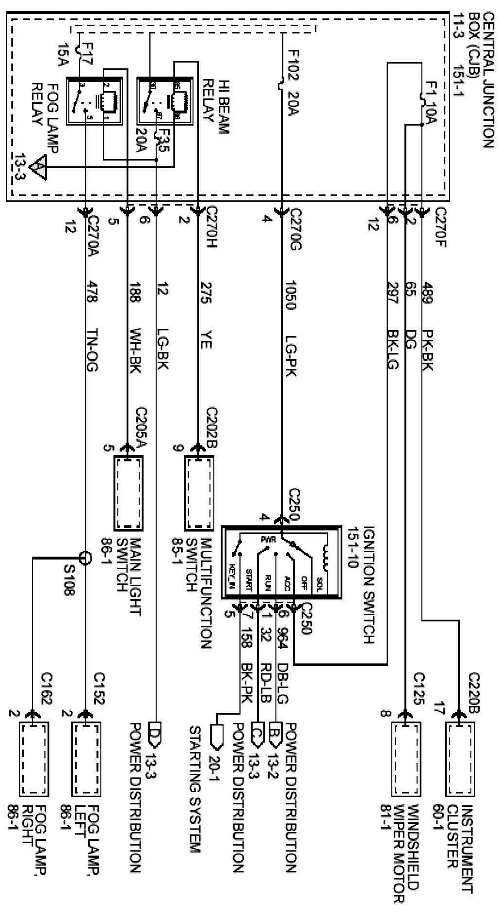 Each set normally starts with the component that powers the circuit, such as a fuse or the ignition switch. Current flow is shown from the power source at the top of the diagram to ground at the bottom of the diagram. A full representation of the power supply of a fuse or the power distribution from a fuse to various components is given in the Power and Ground Distribution Diagrams. Full representation of the ground connections are shown in the Power and Ground Distribution Diagrams.