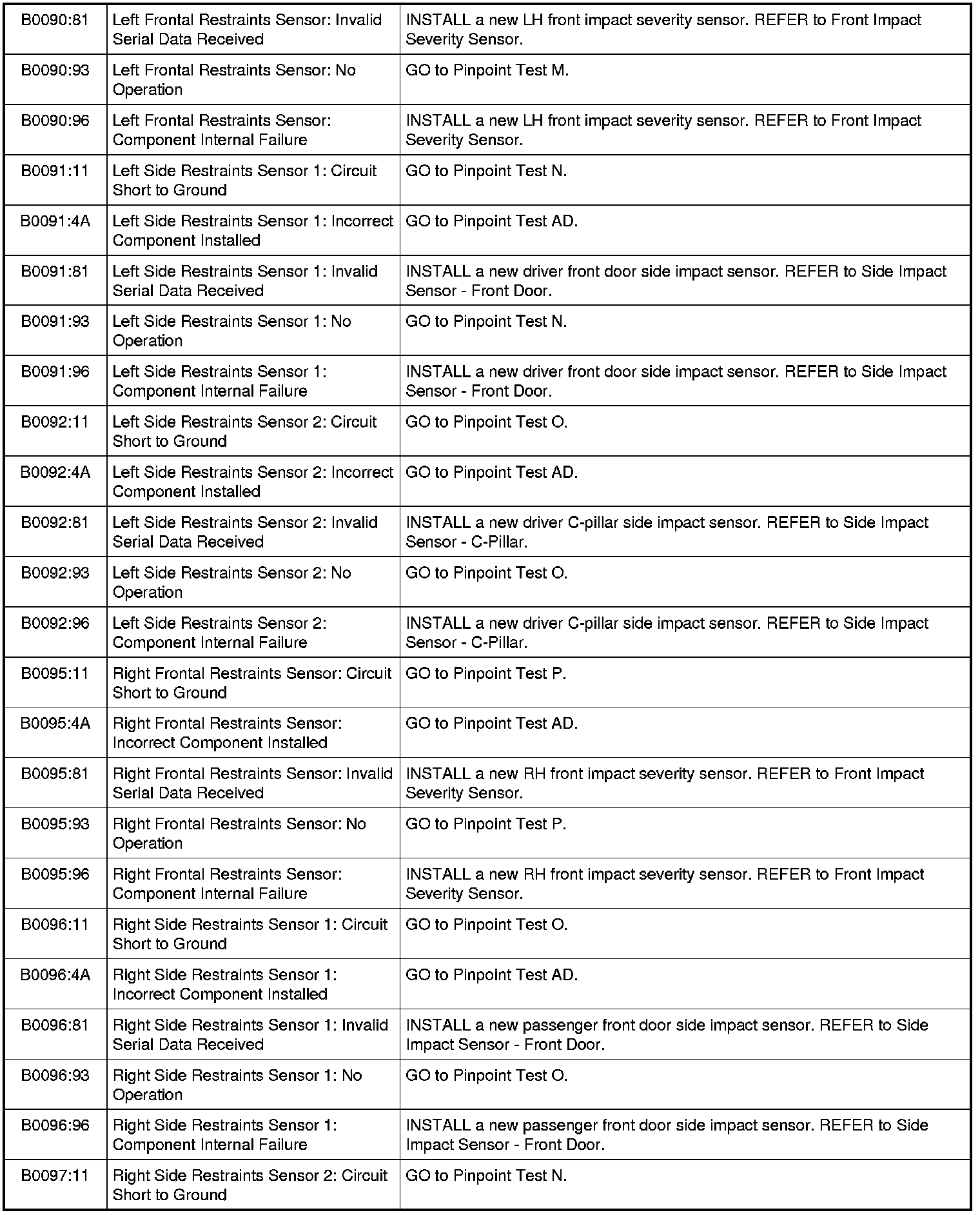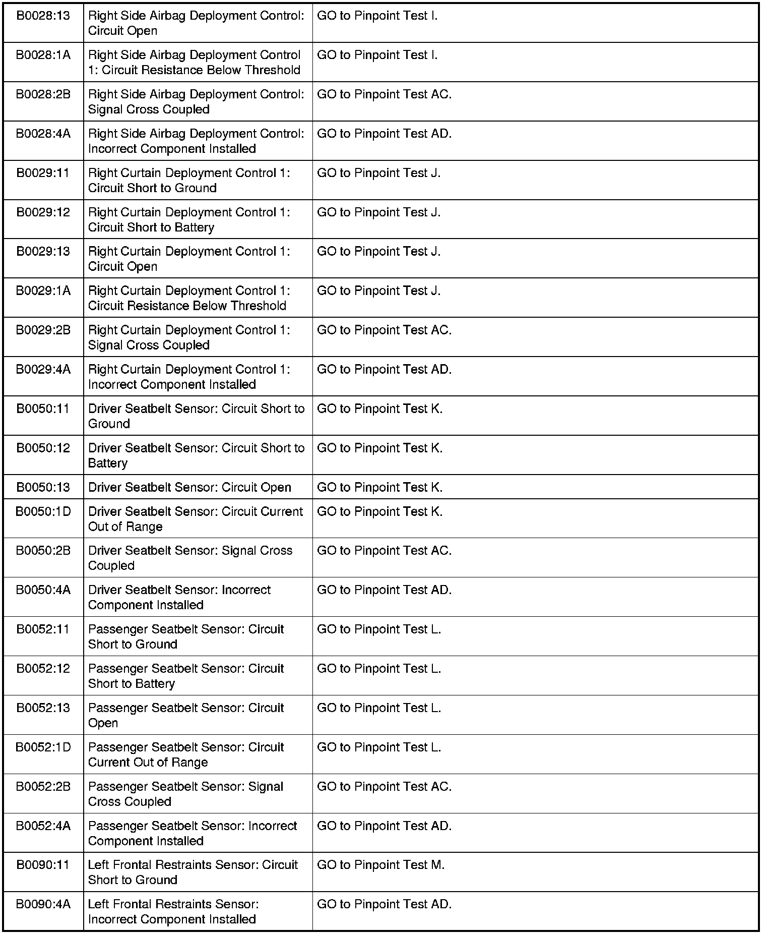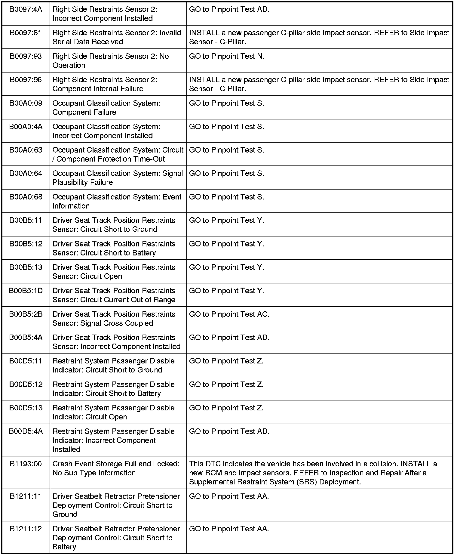 Restraints Control Module (RCM) DTC Chart