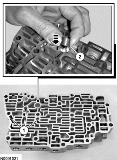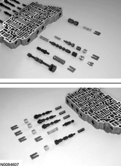5. NOTICE: Remove the valves by tapping the valve body on the palm of the hand to slide the valves out of the bores or by threading a 4-mm bolt into the valves and pulling them out. It may be necessary to remove the valves and springs using a pick. If it is necessary to use a pick, use extreme caution to prevent damaging the valves or valve bores. If necessary, disassemble parts of the main control valve body in small groups. Take special care when handling the main control components, since they are the most precise and delicate parts of the transaxle. Neatly arrange the parts as they are removed to avoid mixing similar pieces.