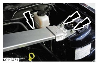 If equipped, remove the 4 nuts (2 shown) and the strut tower cross brace.