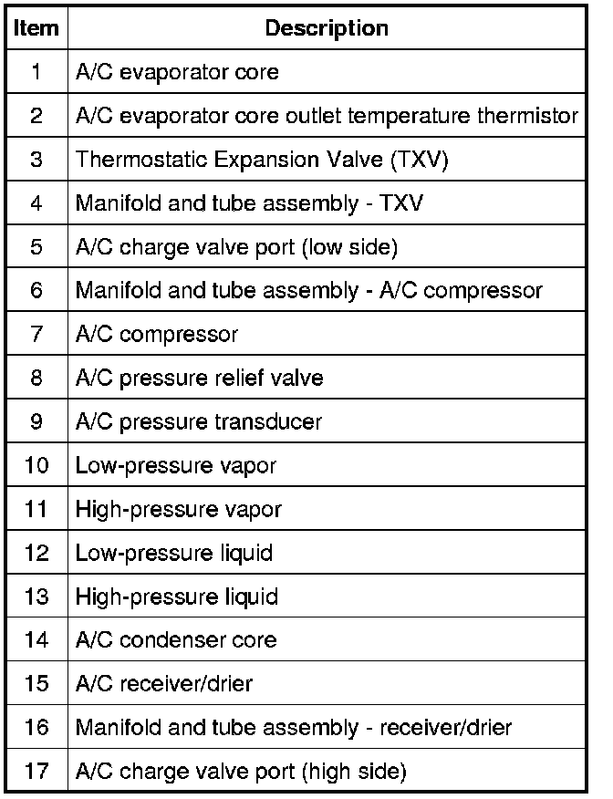 During stabilized conditions (A/C system shutdown), the refrigerant pressures are equal throughout the system. When the A/C compressor is in operation, it increases pressure on the refrigerant vapor, raising its temperature. The high-pressure and high-temperature vapor is then released into the top of the A/C condenser core.