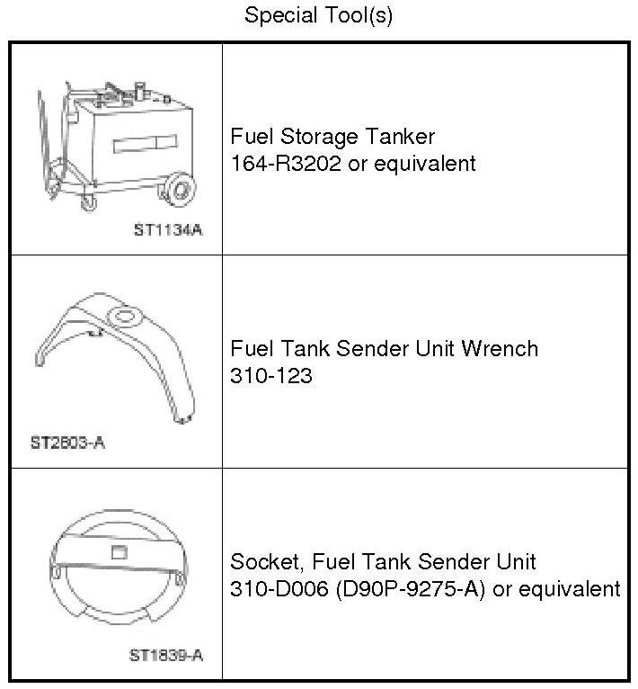 4. NOTE: This step will remove approximately one-eighth tank of fuel from a completely full fuel tank and the majority of any residual fuel from the fuel tank filler pipe. Also the fuel in the fuel tank will be below the Fuel Pump (FP) module mounting flange for FP module removal without fuel spillage.