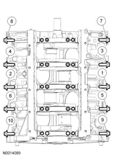 Tighten the vertical main bearing cap fasteners in the sequence shown, in 4 stages.