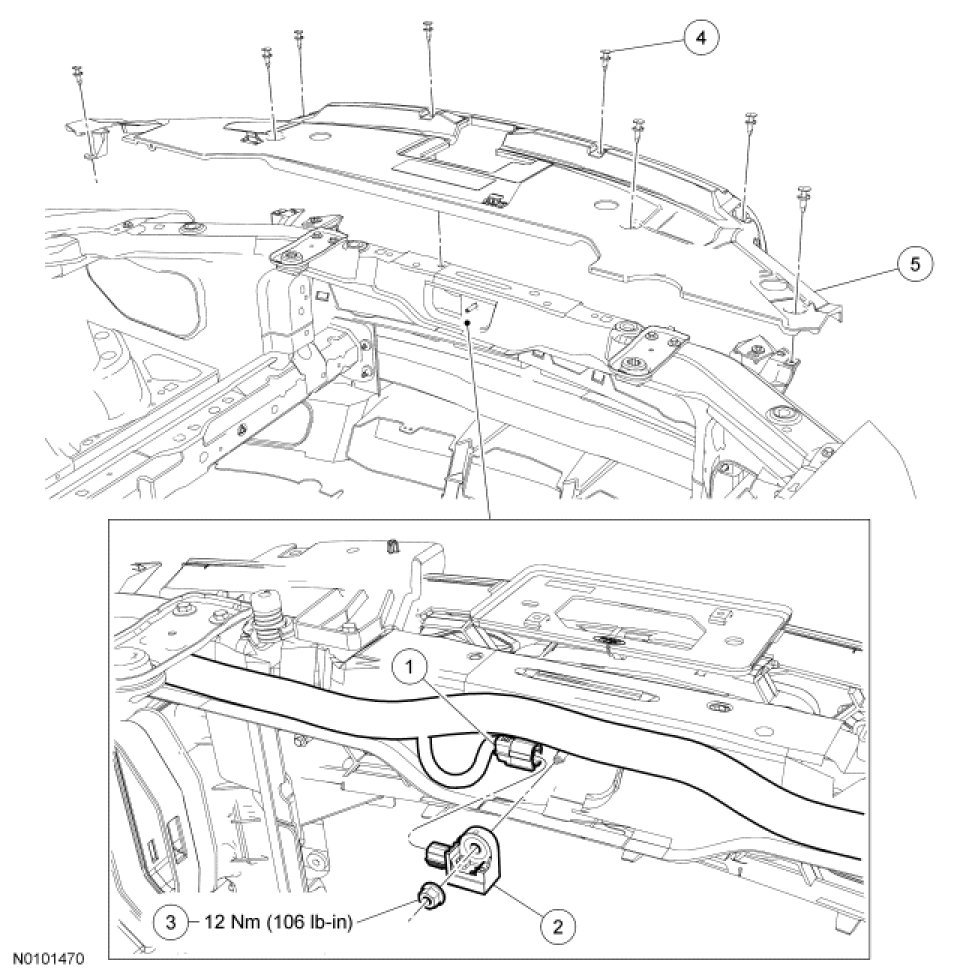 5. WARNING: Always tighten the fasteners of the restraints control module (RCM) and impact sensor (if equipped) to the specified torque. Failure to do so may result in incorrect restraint system operation, which increases the risk of personal injury or death in a crash.