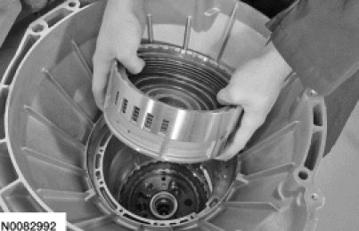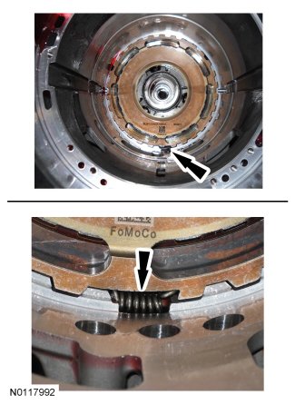 25. Install the low/reverse clutch plates, starting with the pressure plate and alternating between the friction and steel plates and ending with the wave spring plate on the top.