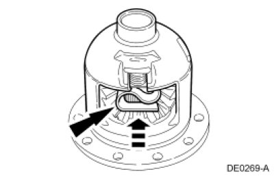 11. Install the 2 differential pinion gear and differential pinion thrust washer assemblies in the differential case.