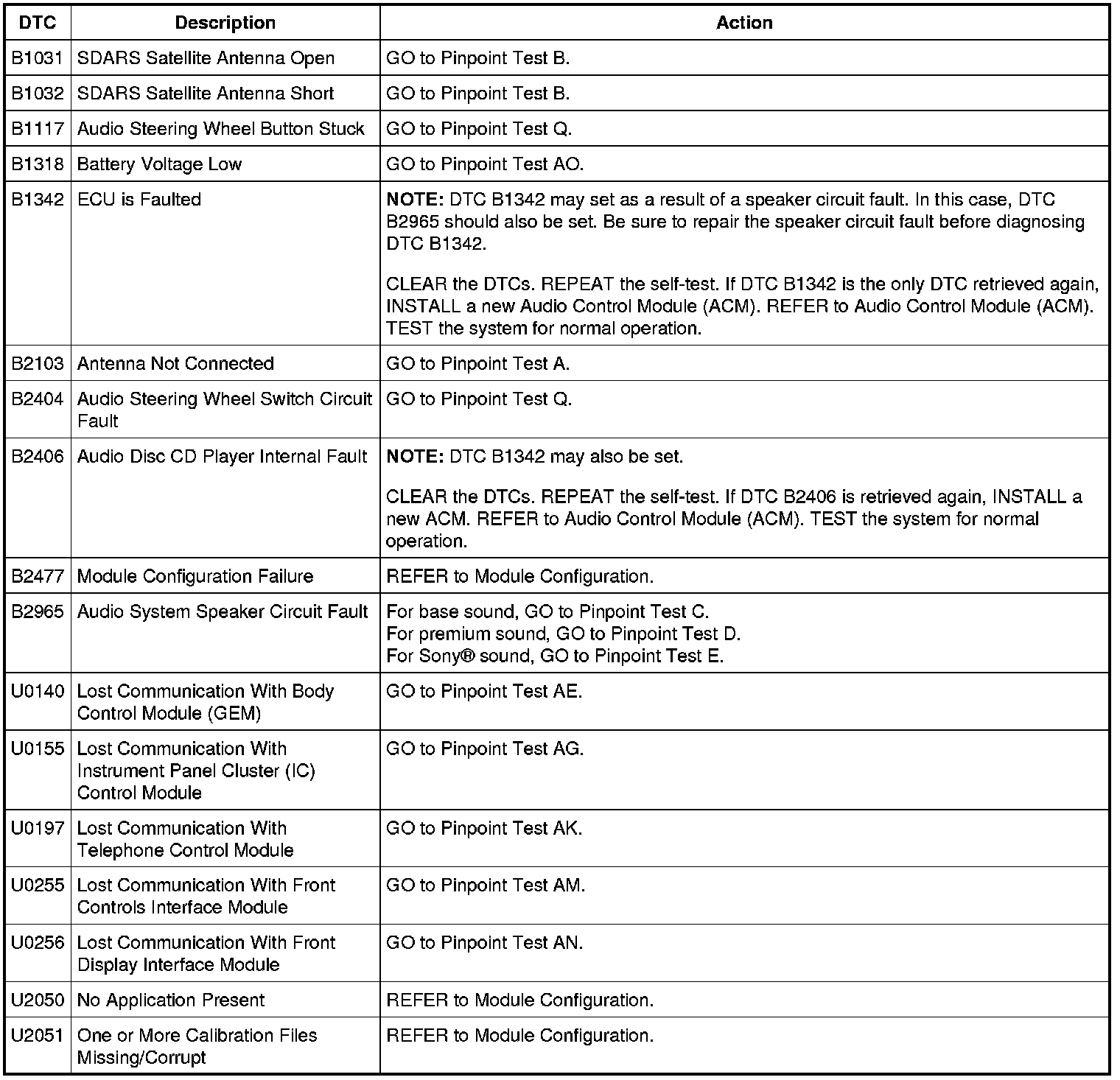 Audio Control Module (ACM) DTC Chart - Without Navigation
