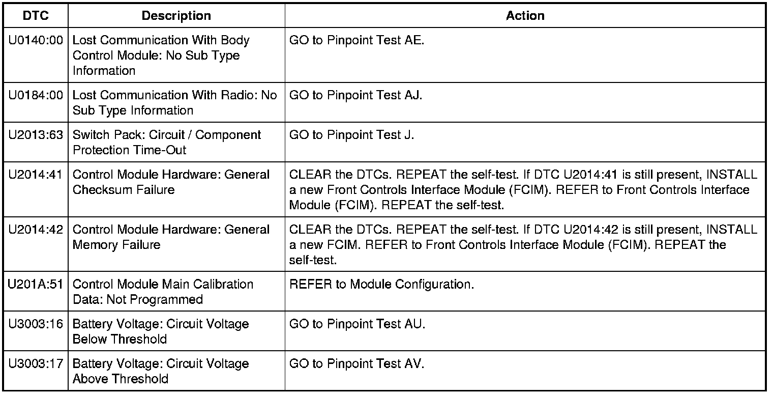 Front Controls Interface Module (FCIM) DTC Chart - With Navigation