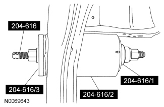 NOTE: When installing the RDU bushing, Rear Drive Unit (RDU) Bushing Remover/Installers 204-616/2 will fall away as the RDU bushing is installed into the subframe. The Rear Drive Unit (RDU) Bushing Remover/Installers do not control the depth of the bushing. The RDU bushing is fully seated when the Rear Drive Unit (RDU) Bushing Remover/Installers fall away from the subframe, do not continue to tighten the Rear Drive Unit (RDU) Bushing Remover/Installers.