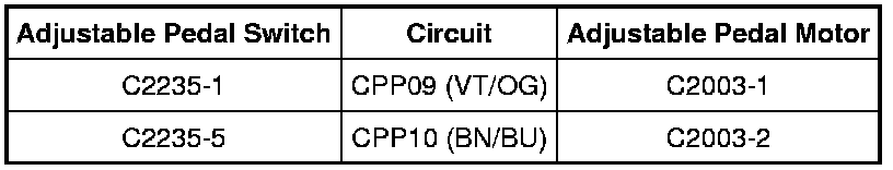 - Measure the resistance between adjustable pedal switch C2235, harness side and adjustable pedal motor C2003, harness side as indicated in the following chart: