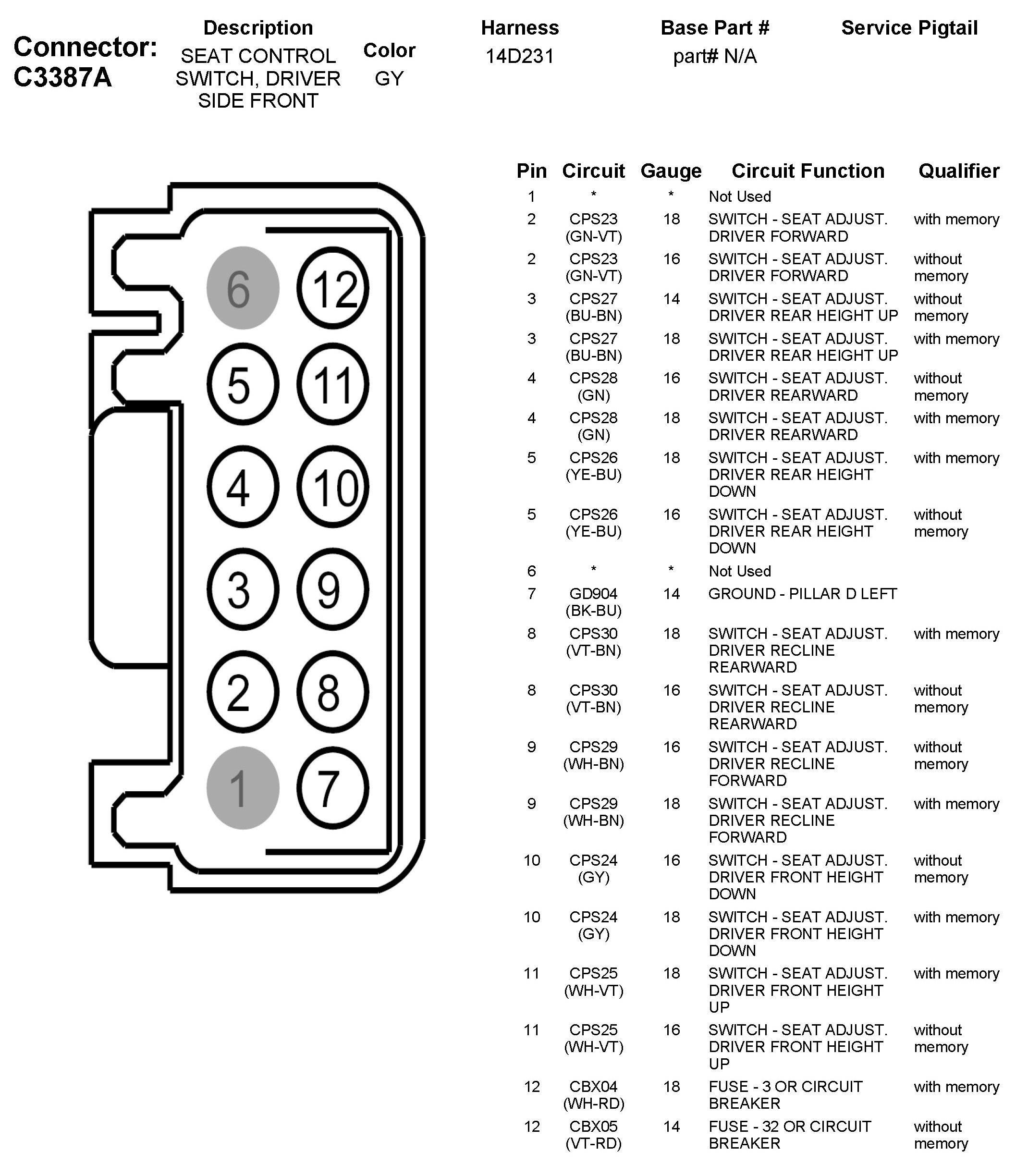 C3387A Seat Control Switch, Driver Side Front