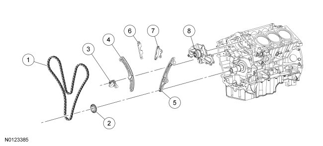 51. NOTE: The engine comes equipped with either a roller primary timing chain or an inverted tooth primary timing chain. The roller timing chain engine comes equipped with either a composite RH timing chain guide requiring the timing chain to ride on the outer side of the guide or a stamped steel RH timing chain guide requiring the timing chain to ride on the inner side of the guide. All roller timing chain engine replacement RH timing chain guides will be the stamped steel design.
