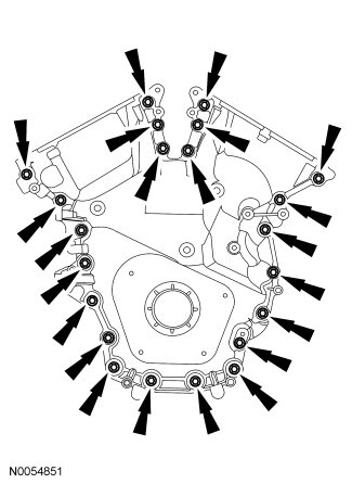 NOTE: The engine front cover and bolts 17, 18, 19 and 20 must be installed within 4 minutes of the initial sealant application. The remainder of the engine front cover bolts and the engine mount bracket bolts must be installed and tightened within 35 minutes of the initial sealant application. If the time limits are exceeded, the sealant must be removed, the sealing area cleaned and sealant reapplied. To clean the sealing area, use silicone gasket remover and metal surface prep. Failure to follow this procedure can cause future oil leakage.