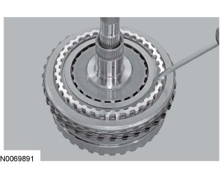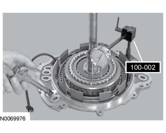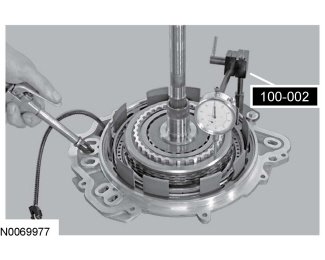 26. Position the Dial Indicator Gauge with Holding Fixture 100-002 on the direct clutch pressure plate. Apply 483 kPa (70 psi) of air pressure to the direct clutch piston port while recording the clutch pack clearance on the Dial Indicator Gauge. The clearance should be between 0.98 mm (0.038 in) and 2.34 mm (0.092 in). If the clearance is out of range, check the direct clutch pack for correct installation. If the direct clutch pack is correctly installed, install a new direct clutch pack.