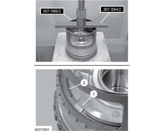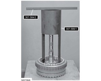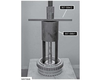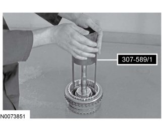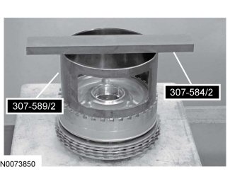 17. Install the new balance piston and install the Overdrive Clutch, Balance Piston and Direct Clutch Compressor 307-589/1 and Forward/Intermediate Spring Compressor 307-584/2 on the balance piston.