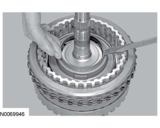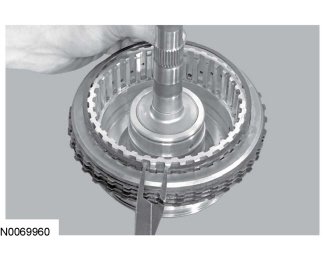 18. Using a press, compress the overdrive clutch piston return spring and install the snap ring.