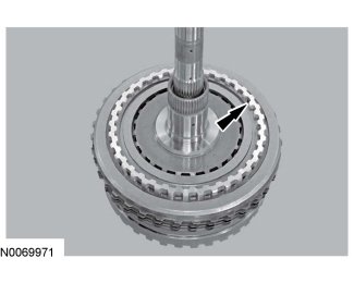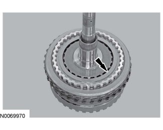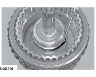 15. NOTICE: Only compress the direct clutch piston return spring far enough to take the tension from the direct clutch cylinder off the snap ring. If the piston is compressed too far, the piston alignment tab may be broken off.